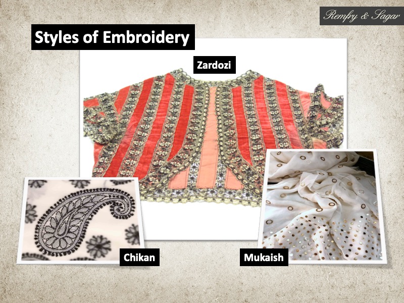 Mukaish embroidery involves twisting thin metallic threads to create patterns all over the fabric – most commonly patterns featuring dots. This form of embroidery was first developed for the Lucknow royalty since Mukaish work initially used precious metals like gold and silver to make threads.