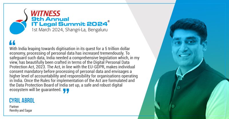 Cyril Abrol, Partner at Remfry & Sagar, spoke on India’s new data protection regime as a panelist at Lex Witness’ ๐Ÿต๐˜๐—ต ๐—”๐—ป๐—ป๐˜‚๐—ฎ๐—น ๐—œ๐—ง ๐—Ÿ๐—ฒ๐—ด๐—ฎ๐—น ๐—ฆ๐˜‚๐—บ๐—บ๐—ถ๐˜ ๐Ÿฎ๐Ÿฌ๐Ÿฎ๐Ÿฐ held on March 1 in Bengaluru. The panel discussion titled, “ARE YOU THEย NEW DATA DON? DATA PROTECTION IS THE NEW YOU” brought out many different perspectives – all eyes are now on the Rules that will give teeth to the legislation.