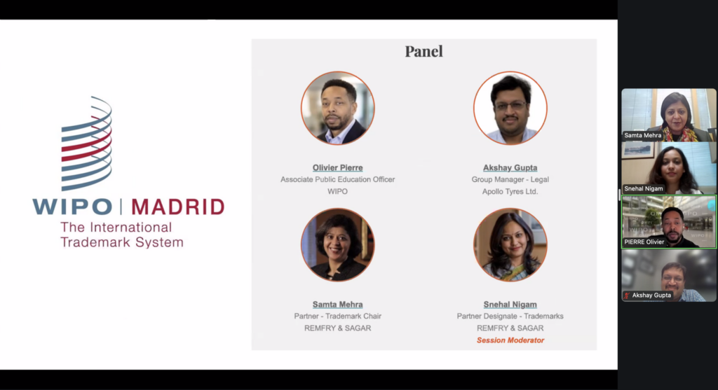 Panelists Olivier Pierre (Associate Public Education Office, WIPO), Akshay Gupta (Group Manager – Legal, Apollo Tyres Ltd.) and Samta Mehra (Partner – Trademark Chair, Remfry & Sagar) discussed tools, strategies and best practices for building a robust trademark portfolio through the International System of registration of marks. The discussion was moderated by Snehal Nigam (Partner Designate, Remfry & Sagar).